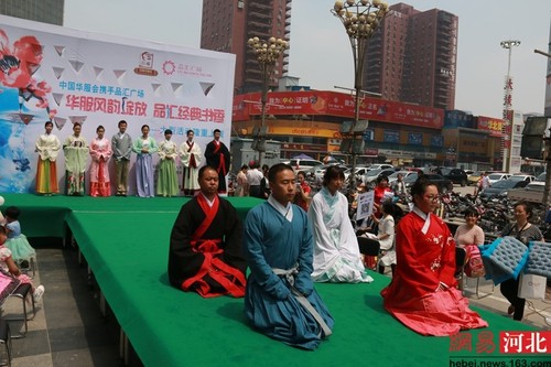 网易河北讯(刘建硕)5月16日,石家庄品汇广场上演了一场传统文化的大型展示活动,这个主题为“华服风韵绽放·品汇经典书香”的活动吸引了大批的市民现场观看,除了传统的旗袍走秀和汉服展示外,现场还进行了茶道表演、传统礼仪演示、民族节目表演、传统知识问答等丰富多彩的内容。