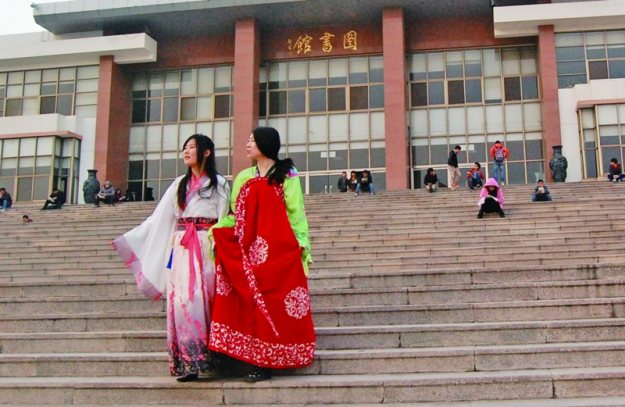 昨天下午,农大图书馆前,大学生们三五成群坐在台阶上看书,中间两个穿着汉服的女孩特别引人注目。“经常看到她们这样穿。”“作秀吧!”“在排练情景剧?”学生们对此似乎见怪不怪,但都说不出她们到底在干什么。说话间,两名“汉服女孩”起身,一路聊一路走着,校园林荫道、教室里、小河边,两人的出现成了一道独特的风景,每到一处立马引来同学们的目光。