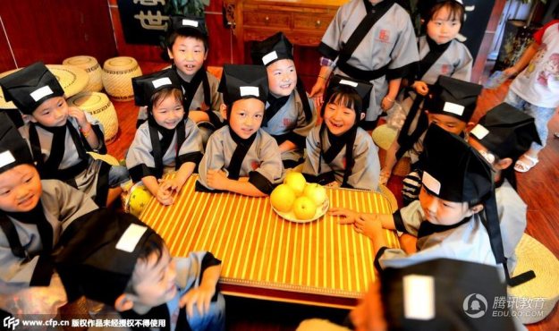 2015年07月17日,甘肃省兰州市,童学馆老师在指导孩子们学习茶道礼仪。暑假期间,甘肃兰州一所以传承和弘扬中国传统文化为目的的童学馆吸引了越来越多家长及孩子的兴趣。在每周固定时间里,都有二三十名孩子在童学馆穿汉服、习礼仪,通过拜孔、馆操、晨读、诵读《弟子规》和学习茶道礼仪等活动感知和学习中国传统文化,丰富暑期生活。
