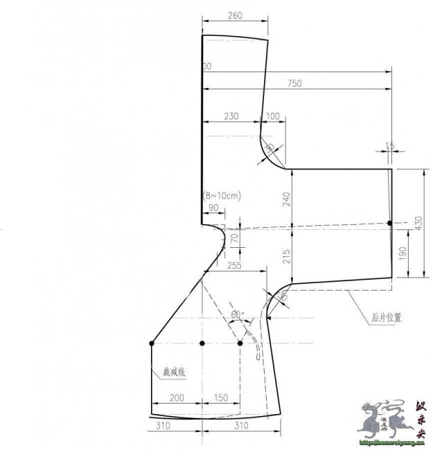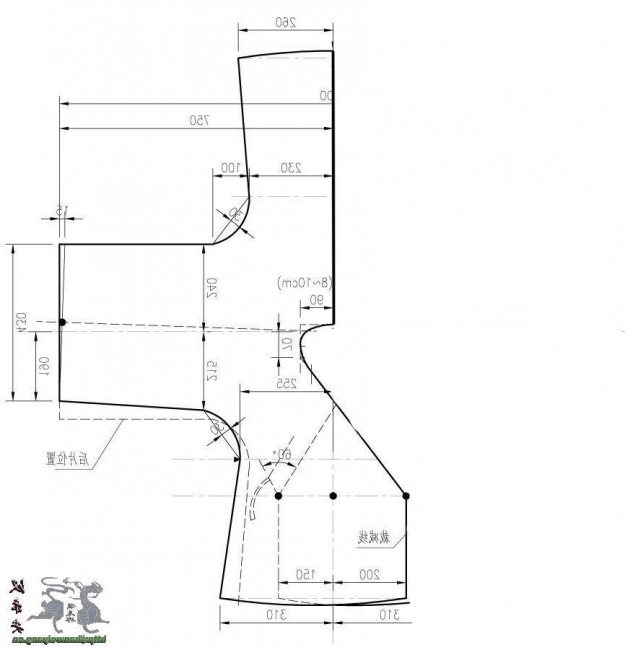 袖窿(袖子与衣身的交界线):袖子下方的线与衣身的交界处宜在胸围线与背长线之间,如果在胸围线之上,则袖窿过窄,如在背长线之下,则袖窿过宽。这条线决定袖子的形状,图中仅为示范,至于是窄袖还是大袖、琵琶袖、直袖,由个人选取的款式决定这条线的画法。后中线:后背正中的线。