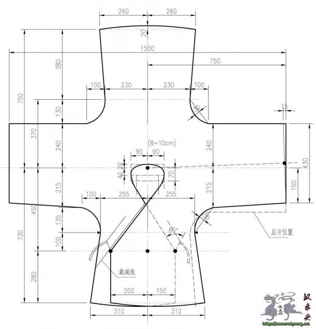 后颈点(脖子后隆起的那块颈椎)量至袖口位置。肩袖长里面还包含袖缘的宽度。长袖可量到手指尖(如果考虑到汉服袖长回肘的说法,可以做得更长一些),短袖除非想做半臂,否则建议最短只做到小臂中部,因为汉女服的讲究是不露手,现代虽然可放宽些标准,但太短了也不雅观。现代参考尺寸(只到小臂与手掌的交界处):S型59CM,M型61.5~63.5CM,L型63~64CM,XL型64.5CM。