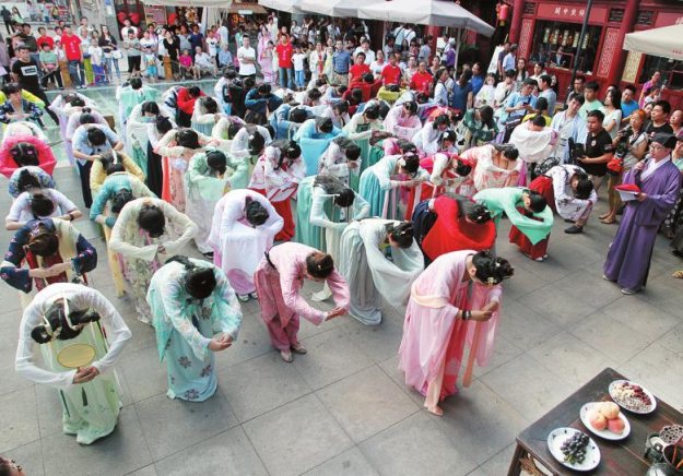 昨日18时许,永兴坊内聚集了百余名穿着汉服的男男女女,五颜六色的服饰将现场装点得别样鲜艳,过往的市民争相与穿着汉服的人合影留念。18:30,伴随着一曲富有古典气息的音乐伴奏,穿着汉服的女子站成一个方阵,在主持人统一的指挥下,女子们一拜一兴,共同向织女星乞求自身智巧,乞求家人安康,乞求国家繁荣。
