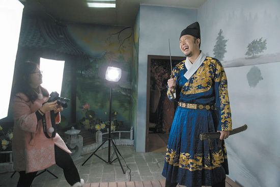 一间500平方米大小的室内摄影棚,被长廊、瓦片、梨树等颇具古韵的布景分割。几名电视台的主持人正穿衣打扮,在专业的化妆师、摄影师的配合下进行拍摄。照片中,女子亭亭玉立,男子风流倜傥。作为年末的活动宣传照片,这效果绝对不错。