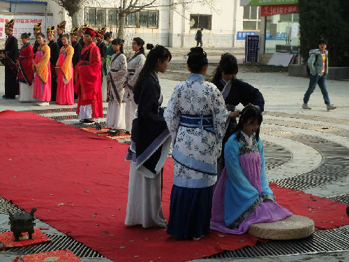 与男子的冠礼相对,女子的成年礼叫笄礼,也叫加笄,在15岁时举行,就是由女孩的家长替她把头发盘结起来,加上一根簪子;改变发式表示从此结束少女时代,可以嫁人了。(编辑 徐浩)