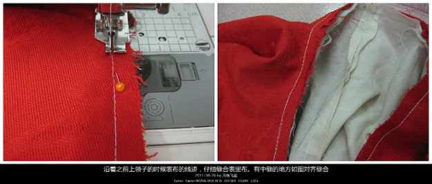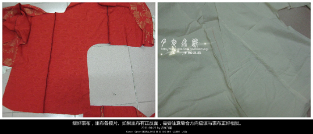 挂里袄子制作教程 爱汉服 2016-03-08 02:45 果布比较节省。画里布的时候就要把这个地方修剪好~ 我的布头很多的。于是剪好了才修剪~ 大家各自随意啊~ 至于。为什么里布要在表布的边外。减掉一点呢?~ 大家可以看看。有的时候。自己带挂里的衣服,如果是制作的不好。 是不是挂的那层里,会掉下来。因为重力的因素吧~(我物理不好) 于是就是很难看的事情~ 所以衣身的长度。里布裁剪上要比表布稍微小点,仅仅说的是衣身啊。其他地方小了。缝起来。表布会好像被什么东西扯住。一样不好看 我这里的里布是先完全和表布一样裁剪下来,这样就能做到里外的接缝什么的,都对的比较整齐。其实里面是看不到的,接袖哪里什么的。也可以一整块布裁剪~开始缝合表里布 这个时候要注意。正面相对缝合~为了固定 精细完工的必需过程---疏缝注意。缝合的止点可以臭美一下了。因为大体已经完成了下面就是上领子。 领子的上法。有好几种。 个人觉得带挂里的话。自己用的这种比较方便。又没有明线。下图几个地方就是。挂里之后应该是要“里布比表布要短的地方”