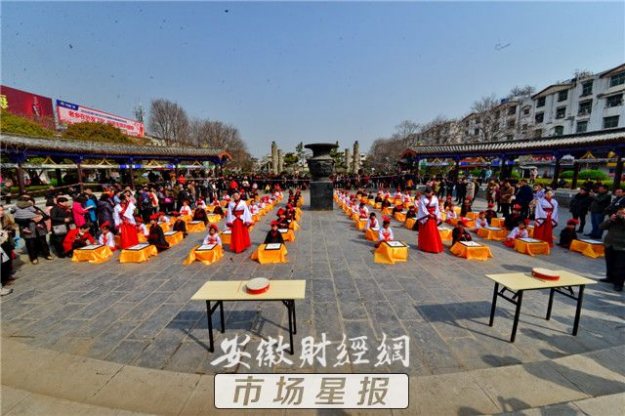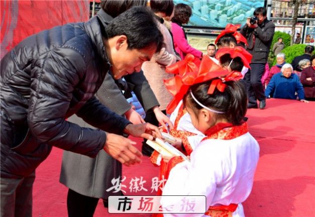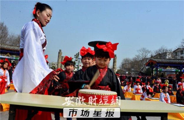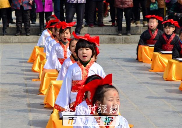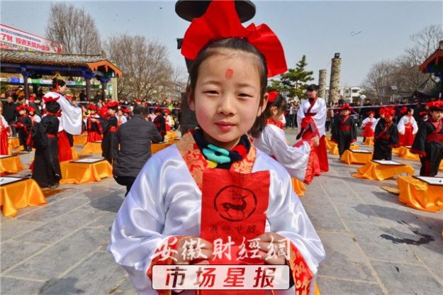 3月10日,阜南县在街心公园举办首届“开笔礼”仪式,孩子们感受中国传统文化。当日,一场汉服开笔礼仪式在该县举行,来自县第一小学校的70名儿童着汉服、行汉礼、书汉字,在老师的带领下通过“朱砂开智”、“击鼓鸣智”等9个步骤体验中国古代传统文化。