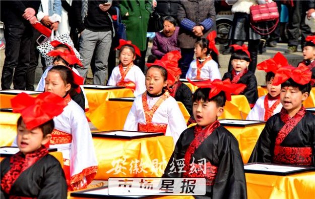 安徽阜南举办首届汉服“开笔礼”仪式 70名儿童穿汉服行汉礼