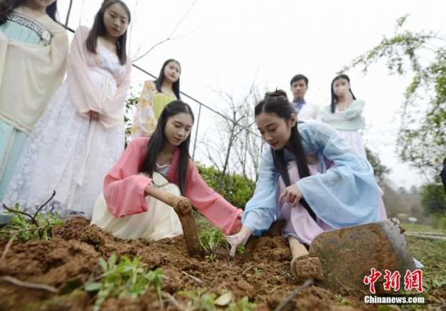 湖南大学生开学首堂实践课 学生着汉服种草药 中新网 2016-03-16 05:50 3月16日,正值国医节前夕,湖南中医药大学的学生开始了新学期首堂室外实践课。学生们身着汉服来到校内的药植园学习种植中草药,弘扬千年中医药文化。