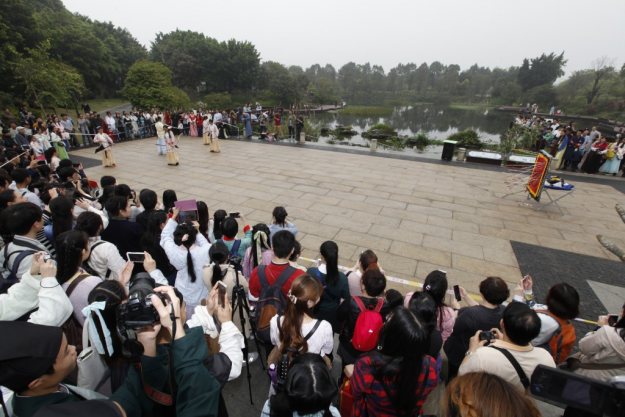 3月19日,广州岭南汉服文化研究会在广东广州海珠国家湿地公园举办穿汉服祭花神、游园大型活动,共度一年一度的汉族传统节日——花朝节。此次活动共有392位同袍报名参与,其中工作人员18名,祭祀人员78名,余下为观礼人员,另外也有自行买票参与的同袍,总人数超过400。