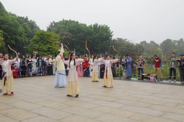 本次活动举行时,广州还依然是雨雾潮湿天气,下午还下起了阵雨,所幸不佳的天气并没有影响同袍们前来参加活动的热情,虽然鞋子湿了、裙子脏了,但在同袍们的脸上还是可以看到愉悦的笑容。从活动开始到现在,大家的朋友圈、QQ空间和微博就不断地被活动照片刷屏,优美的舞姿、帅气的箭阵、隆重的祭祀、萌萌的汉2代、游园时不时遇到同袍,还有很多没来的同袍发表未到现场的遗憾,所有这些都成为大家分享和谈论内容。