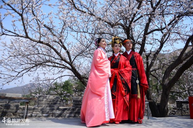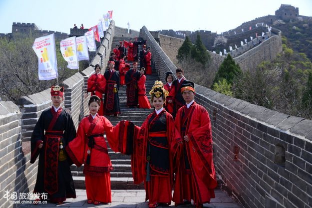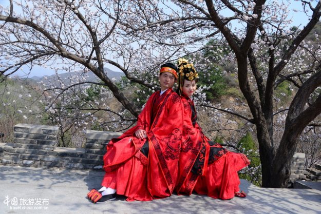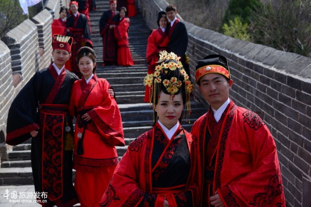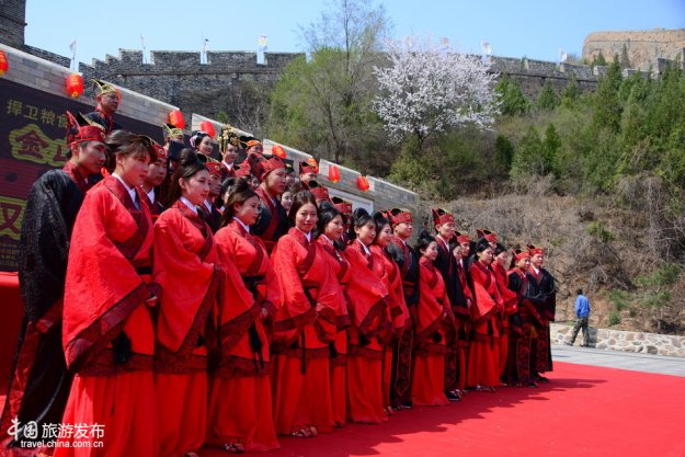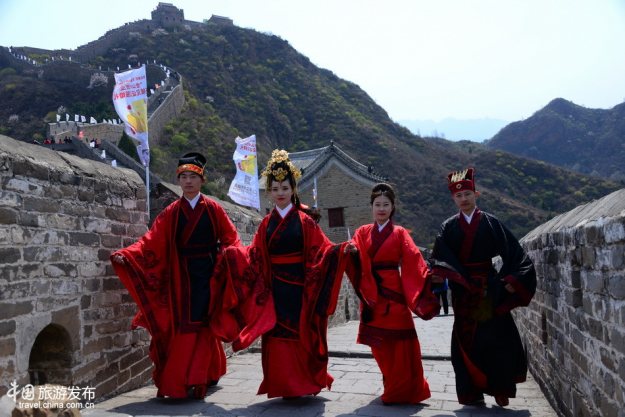 金山岭长城见证新人甜蜜 汉服婚礼style让人震惊 中国网 2016-04-11 07:55 春天的金山岭长城,极目远眺,长城内外杏花烂漫,把蜿蜒的巨龙装点的分外妖娆。此次“汉服婚礼”秀让长城、婚礼、汉服等要素融合,更让人感觉中国传统文化的博大精深、古老长城的伟大。