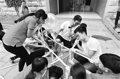 为了不让取水队友的身体触碰到“危险区”,后方队员铆足全身的力气hold住取水的队员。“加油啊!就快拿到了!”队员们在一旁鼓劲。果然,团队的力量是强大的,每一队都纷纷传来喝彩的欢笑声。菲律宾华裔青少年王立雯被“众星捧月”这个环节中大家夹气球的样子逗得哈哈大笑,“我觉得今天的拓展很有意义很有趣,团队精神很重要,只有大家团结才能把事情做好”。