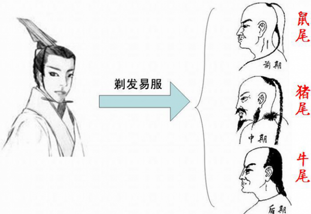 清一代男子的发式经历了数次演变:嘉庆(公元1796年)以前为金钱鼠尾,嘉庆初年进入中期,开始流行猪尾,1825年真实发型仍为--猪尾。清末演变为半光的阴阳头。
