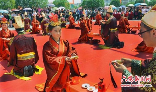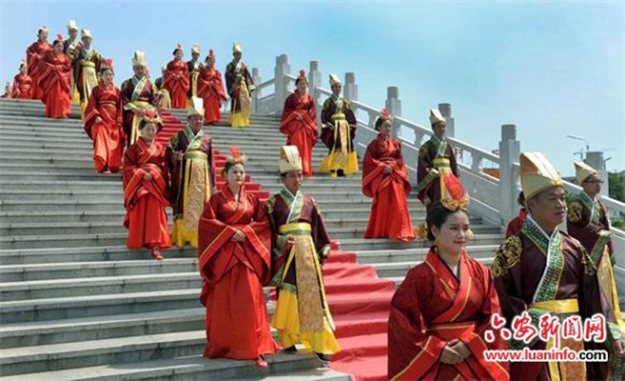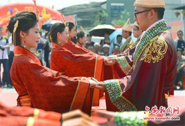 安徽金寨举办汉式集体婚礼 七旬金婚老人穿汉服为20对新人送祝福 六安新闻网 2016-05-05 12:31 5月4日,安徽金寨20对新人举办汉式集体婚礼。新人们身着汉式婚礼袍服,伴随着庄严古典喜乐依次进行沃盥、叩拜、对拜、同牢、合卺、结发、执手等礼仪,喜结良缘。 参加汉式集体婚礼的新人在行执手礼。参加汉式集体婚礼的新娘喜不自禁。今年77岁的杨兴华(右)、75岁的谢慧民(左)喜逢50年金婚纪念日,他们身着汉式礼服,为20对新人送上祝福。参加汉式集体婚礼的新人在行合卺礼。 汉式婚礼隆重庄严、华而不俗、喜而不闹,犹如一幅幅娟秀俊美的画卷,再现了中华传统婚典文化的古韵之美。在社会价值观多元化的今天,越来越多的青年对传统文化产生兴趣,以典雅、尊贵、庄敬为气韵的汉式婚礼受到大别山区越来越多新人的喜爱。