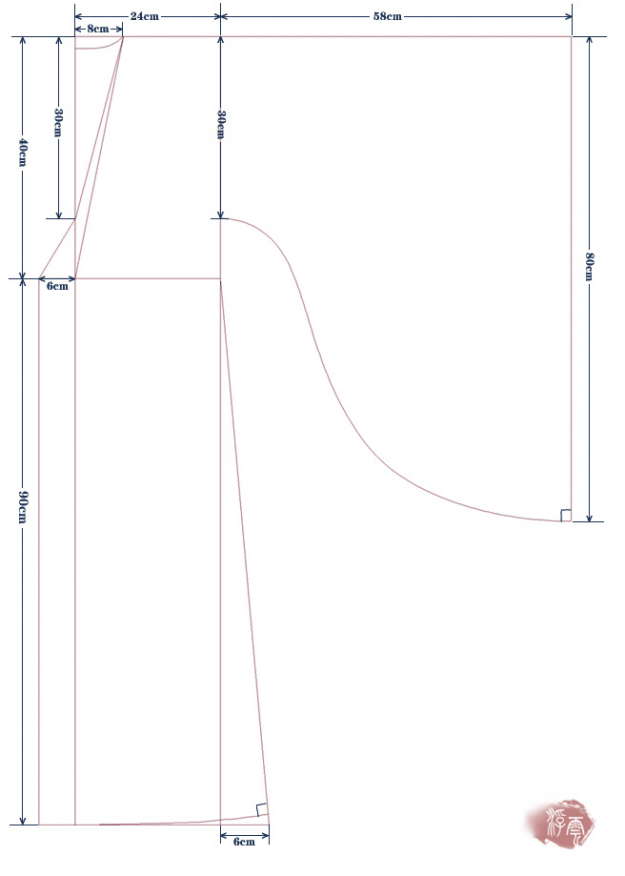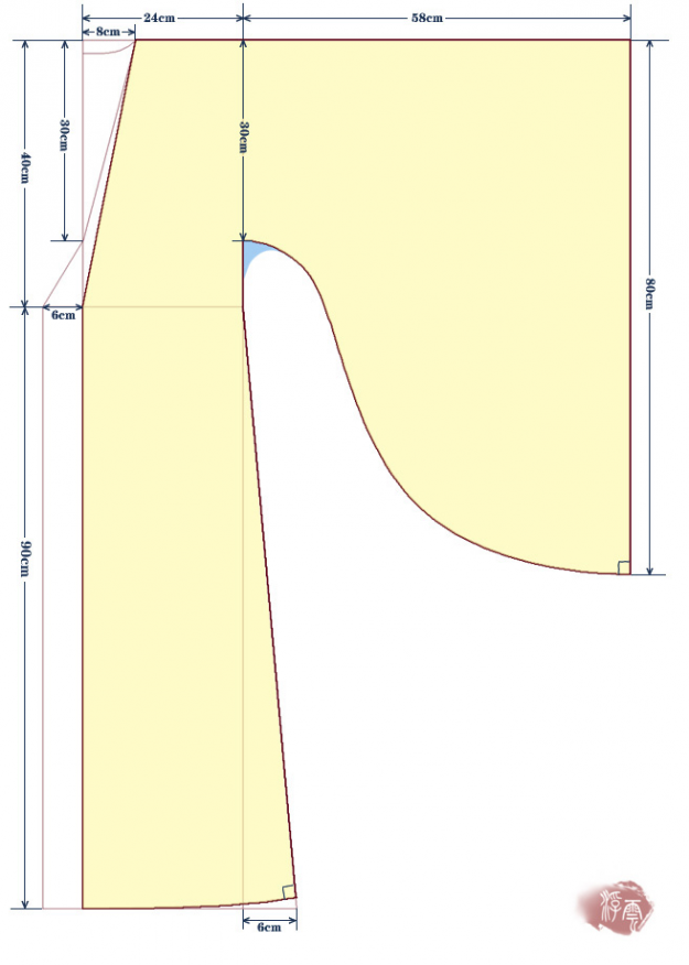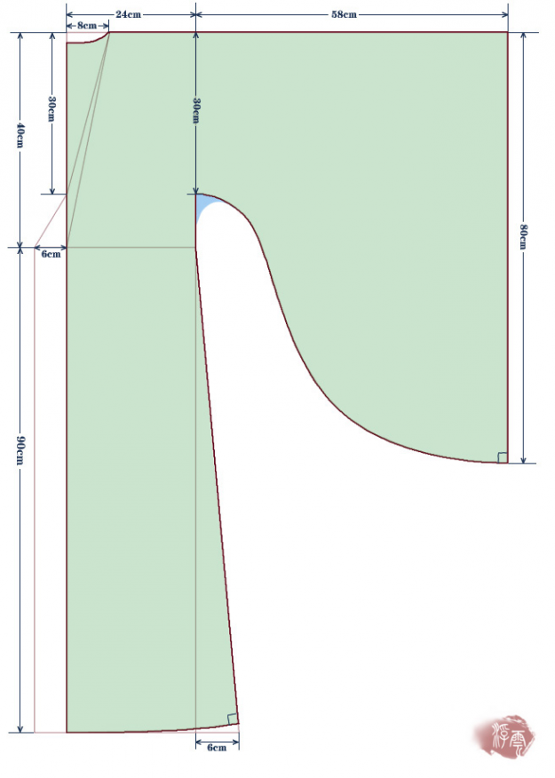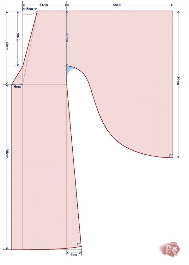 衣服做完后发现大身和袖相接的地方有堆皱现象,回过头研究才发现是纸样缺陷:大身与袖相接处有90度拐角,所以现在把纸样修正加上蓝色部分做圆弧连结,我后来按修改后纸样做的曲裾袖子就平整圆滑很多。。。