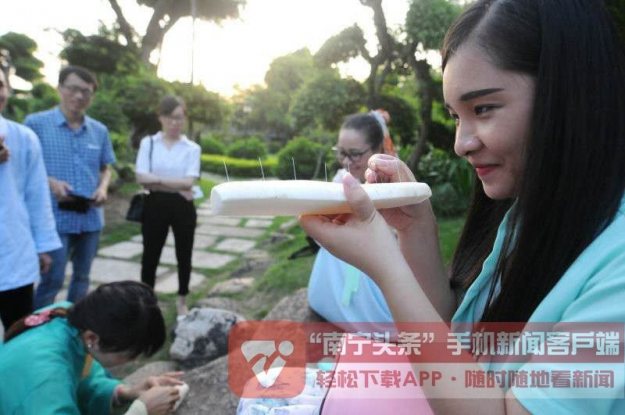 8月6日晚,南宁南湖公园内20多名汉服爱好者穿上美丽的汉服与市民一起穿针、浮针、绣香囊、祭祀织女星等等,共度一个原汁原味的中国七夕节。