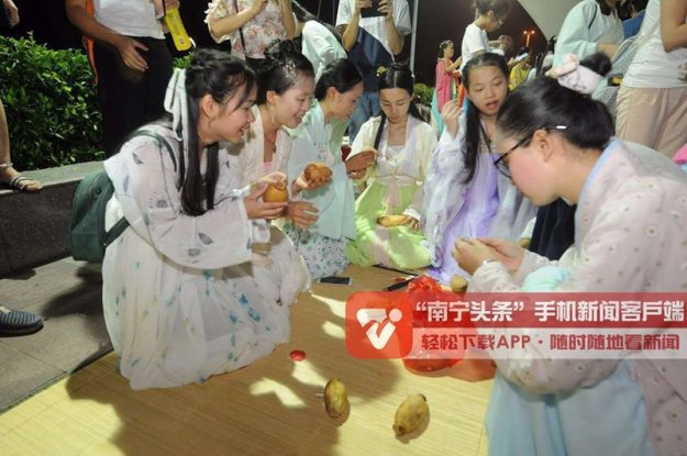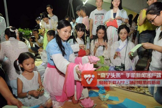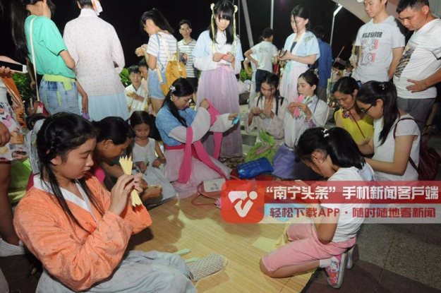 邕城年轻人身着汉服 还原真实七夕节 老友网 2016-08-10 10:19 8月9日晚,来自邕州华夏民俗社的50多位汉服倡导者在民生广场共聚七夕。 他们现场拜织女,和市民一起玩起穿针赛巧、做荷花灯、绳结编织等活动,让市民感受了原汁原味的七夕气氛,还原了“七夕”的本来含义。在很多人把七夕节当成情人节来过,其实在古代,这是一个女子的节日。相传这一天,姑娘们相聚在一起,穿针引线斗巧,编织香囊赛巧,陈列瓜果乞巧,喜蛛织网应巧,投针浮水验巧。不仅如此,七夕还有不少相关的民俗活动,如拜织女,拜魁星,供奉“磨喝乐”等,带有浓厚的民间传统文化色彩。