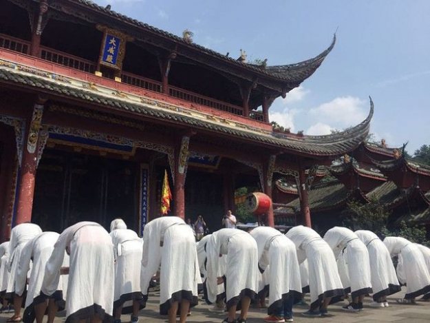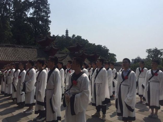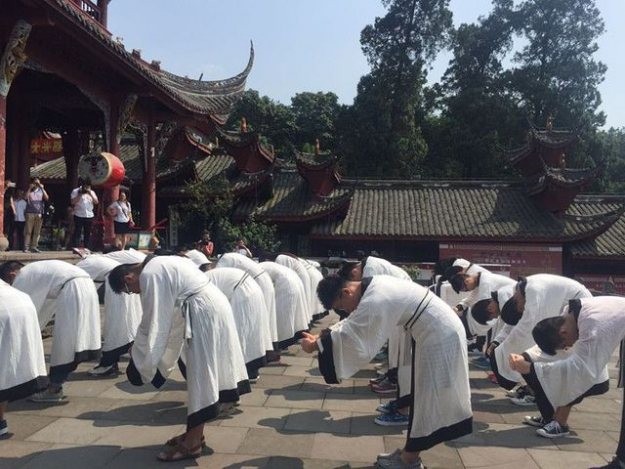 "大学之道,在明明德,在亲民,在止于至善……"今天(8月14日)上午,都江堰文庙内,一群学生身着传统汉服,高声诵读着儒学经典。之前,学生们刚刚在文庙主殿前进行了祭拜孔子的仪式。这是成都玉垒中学以"师爱如山 感恩有你"为主题的2016年高考优秀学子大型谢师典礼活动。近百名考上名校的学生不忘师恩,集体返校以特殊的方式为恩师献上最美的赞礼。这是该校继去年之后,第二次以这种传统的方式来感念师恩。
