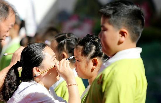 洛阳一幼儿园开学典礼 孩子们穿汉服点朱砂 大河网(郑州) 2016-09-05 05:55 老师为学生们点朱砂上一页 1/3 下一页 据该幼稚园相关负责人介绍:“为天地立心,为生命立命;为往圣继绝学,为万世开太平”是泰伦德国际学校一直以来秉承的教学理念,希望孩子们通过学习国学经典,能够懂礼仪、知廉耻,更好地继承和发扬中华民族传统文化。