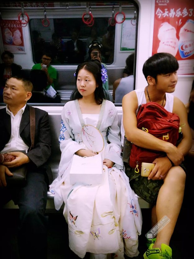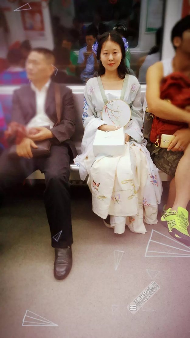 2016年9月7日晚上8点,记者在重庆地铁1号线偶遇两位穿着汉服的丫鬟女孩,两位女孩身穿汉服一出现在地铁1号线,立即引来众多市民的围观拍照。