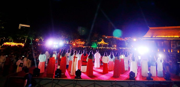9月15日晚上7:30分,为了喜迎中秋的到来,淮安市清江浦里运河畔举行了一场别开生面的中秋拜月祈福活动,面对这一古老仪式,现场吸引1000多名淮安市民争相目睹。拜月之前活动现场表演了与中秋和祭月相关的文艺节目,舞蹈,歌曲,古琴诗朗诵,相声,魔术,戏曲等10个节目博得现场观众阵阵掌声,当然拜月活动是必不可少的,晚上8点钟,拜月仪式正式开始。 当香炉祭品文案摆放在活动现场,文案上的祭品千百年来恒久不变,月饼、水果、菱角、莲藕等祭品必不可少,身穿汉服祭月人员正式开始祭月。