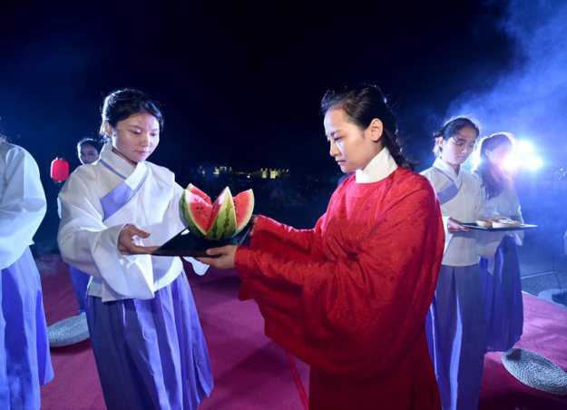 农历八月十四晚7点30分,提前沐浴的参祭人员身着明式汉服,在大报恩塔下向月亮的方向安放好祭桌,点燃红烛,铺设好席子,正坐于祭者席。