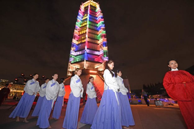 中秋节是中国传统的团圆佳节。9月14日,正值中秋佳节前夜,大报恩寺遗址公园举行公益拜月礼。在身着明朝汉服导师带领下,30多个家庭通过净仪、请月、祭月、拜月、礼成等仪式环节,寄托风调雨顺、月圆人圆、家和国和天下和的美好祈福。而南京城市新地标的大报恩塔,也在中秋期间通过塔身投射,向全球华人送上节日祝福,成为南京城佳节一景。