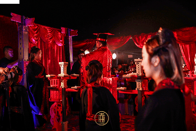 终其一生,多数人的婚礼可能都接触不到这样的时刻。在城市边缘的庄园中,远山如黛,虫鸣琴韵,宾朋云集,把酒合欢,新人于吉时着玄衣纁裳从果林掩映中款款而来,庄重大气宛如王者。