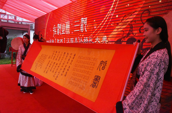 本次活动中,组委会邀请汉文化专家作为顾问,对各个环节进行把关,尽量还原古代结婚礼制,尤其值得一提的是,为新人制作的婚书也出自省内著名书法名家江建龙先生之手,具有收藏价值和纪念意义。