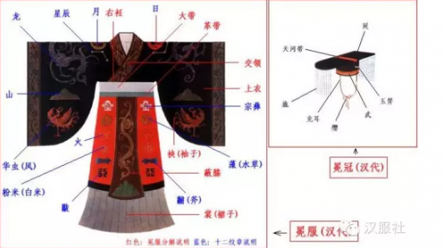 衣服上绣日、月、星辰、山、龙、华虫、宗彝、藻、火、粉米、黼、黻十二章纹。十二章纹并不是任意为之的,而是具有象征意义。