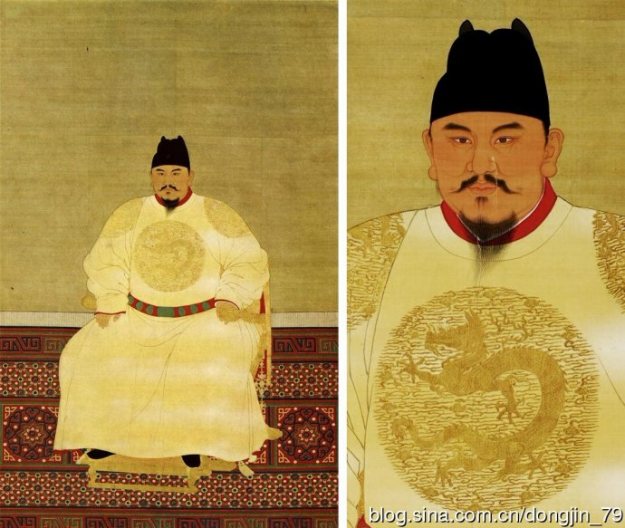 明初期的龙纹继承了宋元以来的风格,龙的造型以侧身为主,龙嘴紧闭,鬃毛上扬,身体修长,四肢有力,给人以威严大气、稳重肃穆之感。其整体风格与明代政权刚刚建立、处于休养生息阶段的大环境吻合。故宫博物院收藏有一幅明太祖画像,画中太祖身穿常服,在黄色盘领窄袖袍的前胸、后背及两肩位置装饰有四条金织盘龙,具有典型的明初特征。民间流传有各种明末、清代及民国的“朱元璋”怪脸画像,皆出于臆造,人物的服饰、纹样都与明代初期不合。