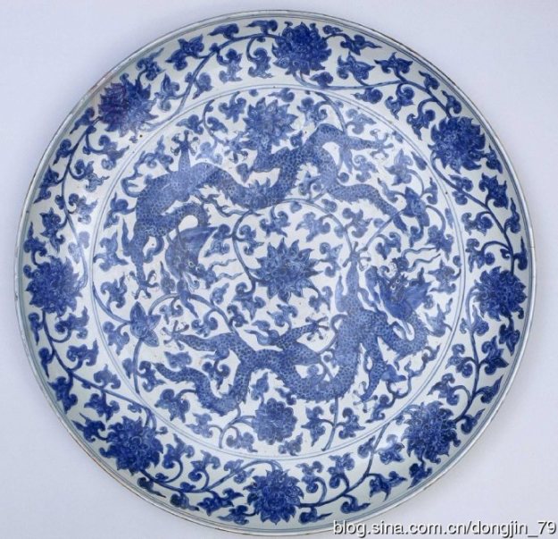 明中叶,王朝经过前期的发展,已经进入到一个相对稳定的时期。此时的龙纹风格与初期大体相似,身体仍较瘦长,但龙的嘴部已张开,表情姿态更加丰富,开始了个性的张扬。如故宫博物院所藏明嘉靖时期的青花龙穿缠枝莲纹大盘,盘正中绘有升龙与降龙各一条,体态轻盈矫健,充满活力与动感。
