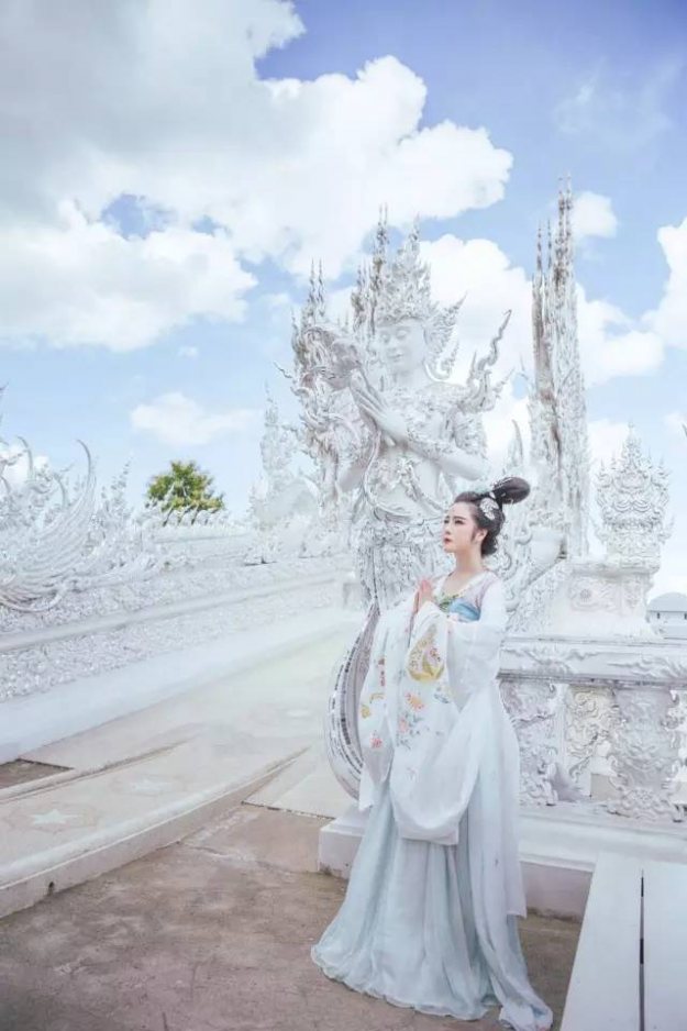 带到泰国,在白庙前,一袭汉服,拍出了武则天的霸气和威武;