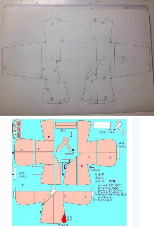 ➤裁剪图:用的还是做明制交领衫的那个,至于琵琶袖,我没有具体的版型,这里提供一个带数据的剪裁图,自己用报纸、牛皮纸先打好版,多画几次,挑选最合适的就行。
