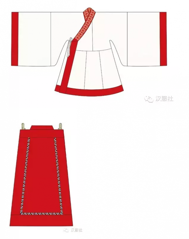 皮弁服下裳与冕服(永乐制度)所用相同,红色,分为前后两片,前片三幅,后片四幅,共裳腰,裳幅上折有襞积(褶子)。裳前后片的两侧与底边施本色缘边(即綼和裼)。红裳上亦不织章纹。