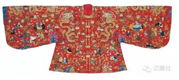 出土的吉服类女衣,有些在衣身装饰云肩、通袖襕纹样,绝大部分则是在前胸和后背缝缀方形或梯形的补子(前襟左右各一片、后襟一片)。补子多为绣制,少数为缂丝,补子的图案以云龙纹较多,其次有龙凤纹、凤纹、花卉纹、百子纹、应景题材以及万寿、万喜、洪福齐天等吉语文字。