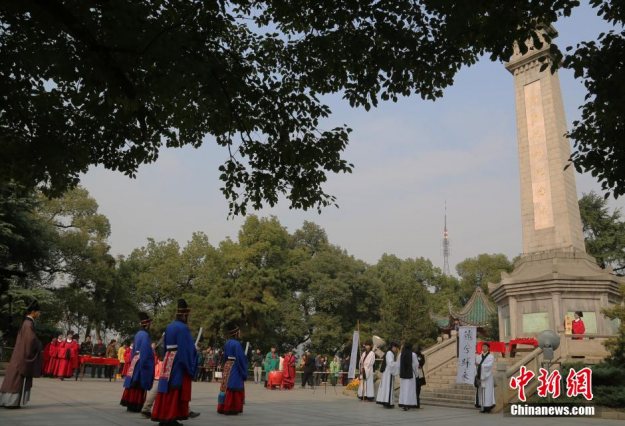湖南衡阳汉服同袍着汉服祭祀抗战英烈 中新网 2014-12-24 12:05 上一页 1/8 下一页 12月21日,湖南衡阳市汉文化研习会的汉文化爱好者着汉服在抗战纪念碑前举行大型传统祭祀活动,追怀在衡阳保卫战中英勇牺牲的革命烈士。该研习会介绍,22日系“冬至”,中国古代均会在此节气前后举行大型祭祀活动,如郊祀祭天祈求丰年、沙场凭吊追怀烈士、宗庙家祭礼奠先人。该协会举行此次大型传统祭祀,旨在追怀革命烈士。南华大学等六所高等院校的大学生汉文化爱好者参加祭祀。图为汉文化爱好者在衡阳抗战纪念城碑前举行传统祭祀活动迎冬至。曹正平 摄
