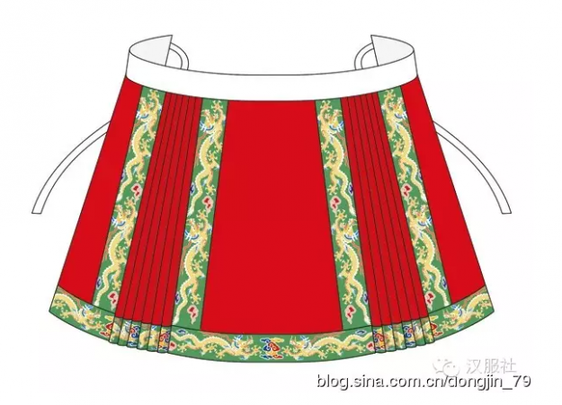 缘襈裙,形制与俗称的“马面裙”一致。裙为红色,白色裙腰,裙腰两端缀白色系带一对,前身正中为一幅光面,两侧作密褶,左右各接一幅,围合重叠于身后。裙的底边与正幅、左右两幅的侧边均施绿色缘边(边襕),饰织金彩色云龙纹样。定陵出土有装饰边襕的裙子,如孝端显皇后的红仙鹤灵芝托织金寿字纹地妆花龙襕缎裙(D19:1),前面一幅有两条竖襕,襕内饰龙赶珠、海水江崖(寿山福海)及花卉纹样。两襕之间的横襕内饰正面龙戏珠及八宝花卉纹,上有流云、下有海浪。两侧横襕内饰龙戏珠及桃花、牵牛花、荷花、菊花、茶花等花卉纹,上有行云缭绕,下有海水江崖,并以八宝纹点缀其间。形制相似的裙子还有几条,因缺乏更详细的信息,是否为皇后常服所用缘襈裙尚难确定。