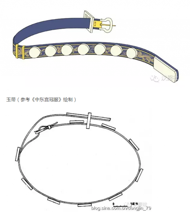 玉带即革带,《明会典》记载:“玉带,青绮鞓,描金云龙文,玉事件十,金事件三。”其形制与礼服的玉革带相同,带身为一整条,外用青绮包裱,饰描金云龙纹。所缀金、玉事件亦不明确。从《中东宫冠服》的插图分析,带身一端缀玉钩 <角枼>(带扣),另一端缀玉挞尾,挞尾前有圆桃七块(桃尖皆朝向挞尾),带身还有金质带箍等。定陵出土了孝靖皇后一条玉带(X17:6),带身为黄色素缎两层中间加夹皮革一层,其上缀圆桃九块,排列方向一致。革带一端缀挞尾一块,带身里侧缀副带,上有带眼;另一端连有带铜钎的玉带扣及玉“方策”(穿扣)各一件。系带时,将里侧副带穿入带扣内,即可系牢,又便于调节长短。里侧副带束紧后,革带的挞尾则穿入玉“方策”(穿扣)内,遮盖住里侧的带扣。这条玉带有可能是皇后常服所用。