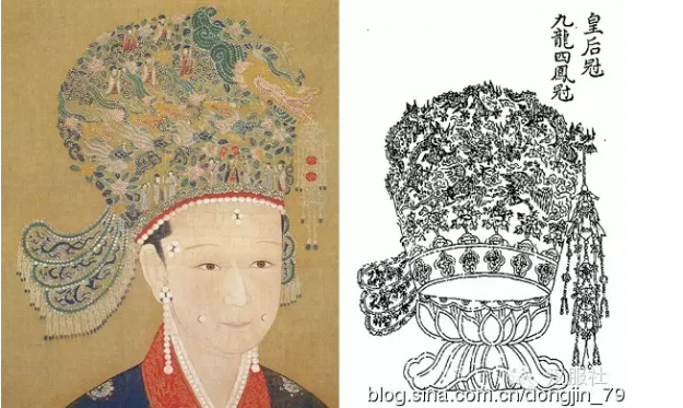 左:宋高宗皇后像(台北故宫藏);右:明初九龙四凤冠(《明集礼》插图)