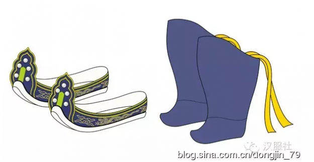 袜以青罗制作,袜上有系带。舄用青绮制成,舄身饰描金云龙纹,在鞋帮处用皁线缘边(纯)。舄首上翘,做成如意云头形,上缀珍珠五颗。慈圣太后冠服有“青纻丝描金云龙滴珍珠舄二只”。