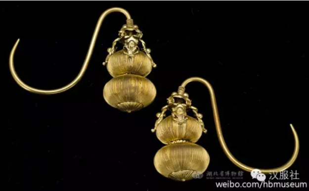 明代 拉丝葫芦形金耳环 。宽6.2厘米,高4.7厘米。坠部葫芦造型,拉丝工艺,上盖四叶。蕲春县博物馆藏。