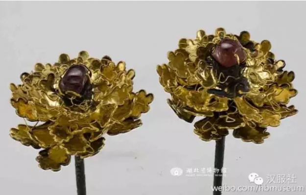金镶宝石牡丹簪 明代。长10.3、花径4.5厘米 重38克。蕲春县博物馆藏。