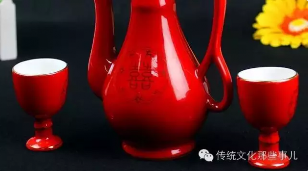 到了民国的时候,用彩绸或彩纸把两个酒杯联接起来,男女相互换名,各饮一杯,象征此后夫妻便连成一体,合体为一。当然很多情况下,“惟新妇羞涩,不肯染指一尝”。