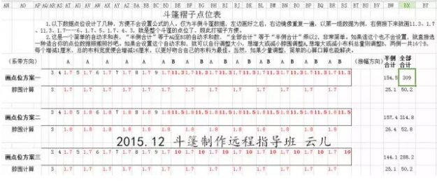 这是一个简单的自动求和表,“半侧合计”等于AQ至BS的自动求和数,“全部合计”等于“半侧合计”乘以2,如果不会设置excel,就直接选下图中一种适合你的点位数据方案照搬照抄吧。