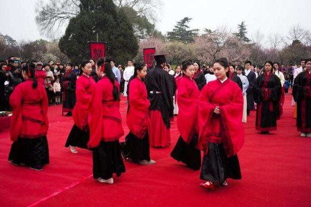 梅花树下,一袭红装素裹,或宽袍大袖,或峨冠博带,或紧身窄袖,或木钗布裙,相向行古礼,身处其中,仿佛梦回汉朝。