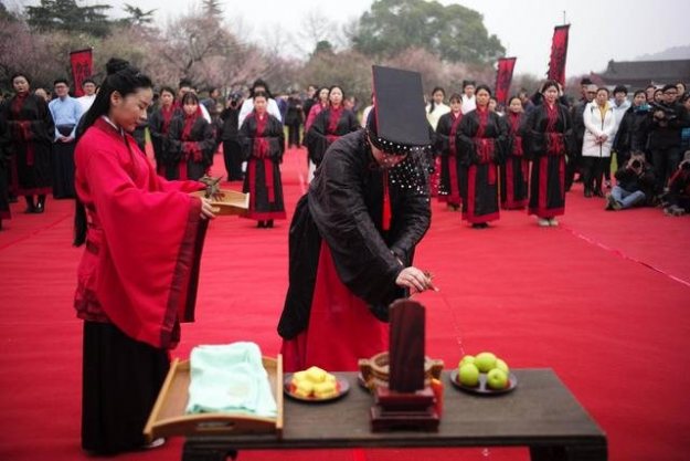 吉时到,随着悠长婉转的音乐,焚香祭天、左右龙凤鼓、铜鼓礼乐现场奏响,汇聚而来身着汉服的汉服爱好者彼此行初献礼,行亚献礼,行终献礼。再展汉文化祭祀典礼的原汁原味,而各种祭器、礼器、祭品、乐器、服饰等,还其真貌,声色俱佳,古朴之风款款而来,场景极具历史观赏性和真实的传播性,使与会者享受一次汉文化的教育和熏陶。