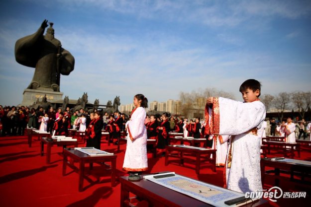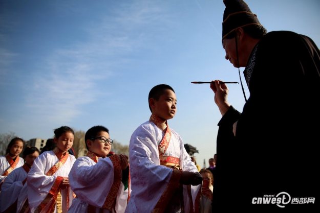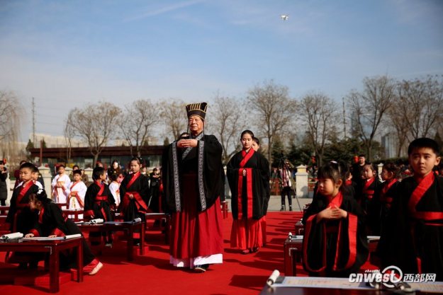 奉茶礼、正衣冠、点朱砂、击鼓鸣智、诵读经典……今天(2月9日)下午,西安汉城湖第五届开笔礼活动举行,60名6至10岁的学龄儿童,在汉城湖畔真切感受了一场庄重的“开笔礼”仪式。