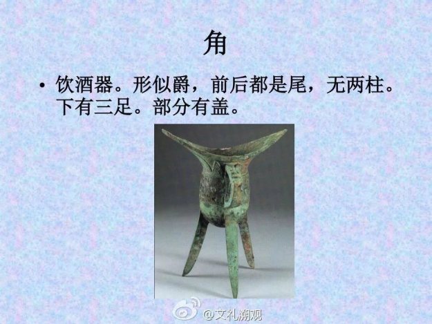 【角:角是古代汉族的饮酒器。形制与爵相似,但无流和柱。最初当为普通饮酒器皿,供低级别贵族使用。角的出土和传世数量远远地少于爵,商周之际发展为造型精美的礼器,流行于周中期之前,之后开始衰落。角是从爵演化出来的一种新型酒器,大量出现于殷商晚期或商周之际。《礼记·礼器》说:"宗庙之祭,尊者举觯,卑者举角"。】