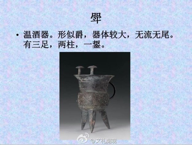 酒文化到底多深厚?看下面这些青铜器具就知道了!角:饮酒器。斝(jia) :温酒器。觚(gu) :饮酒器。觯(zhi): 饮酒器。 兕觥(sigong): 盛酒或饮酒器。尊(zun):盛酒器。卣(you) :盛酒器。盉(he) :盛酒器。彝(yi):盛酒器。勺(shao) :取酒器。罍(léi) :盛酒或盛水器。壶(hu):盛酒或盛水器。爵(jue):饮酒器。